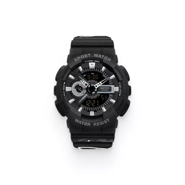 This is a men’s black sporty watch that fits your daily needs and outfits with multiple functions such as an alarm, a world timer, and day/date/month features.