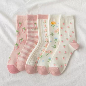 Charming Harajuku Kawaii Cotton Socks with Strawberry & Floral Patterns