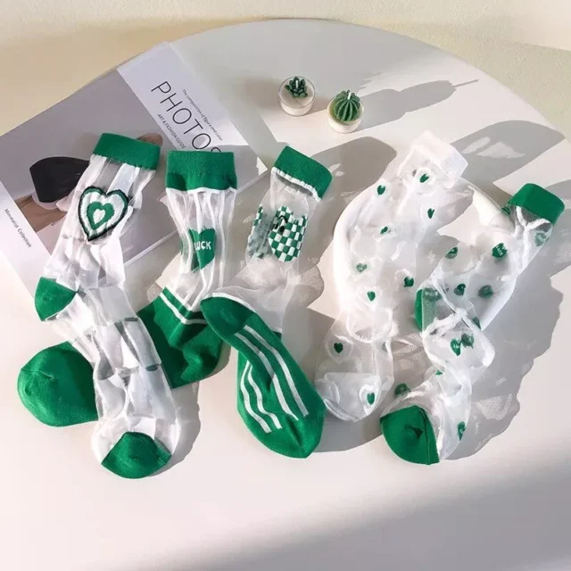 Summer Kawaii Mesh Thin Glass Crystal Silk Transparent Socks Woman Girl 2023 New Funny Heart White Green Long Slippers Stockings