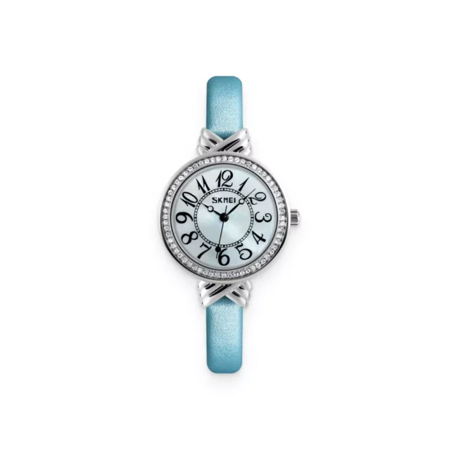 I love this watch, It is exactly what I was looking for. Face of the watch is beautiful and the light blue leather band really complements it. I have received several compliments on it. I would buy it again.